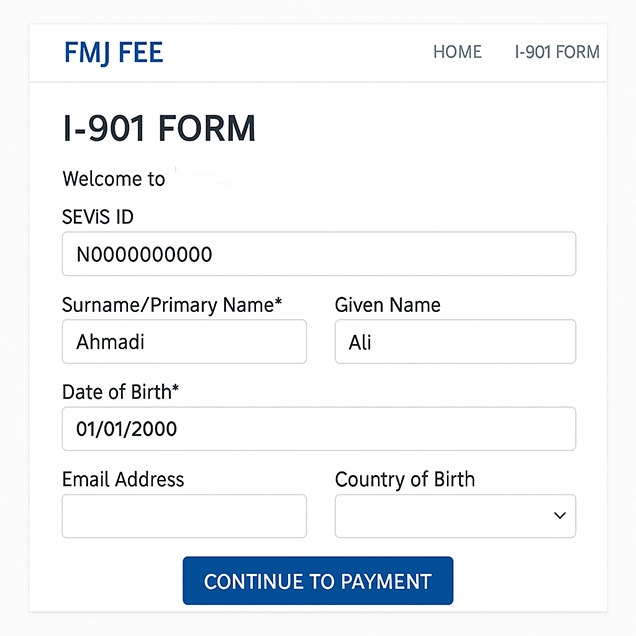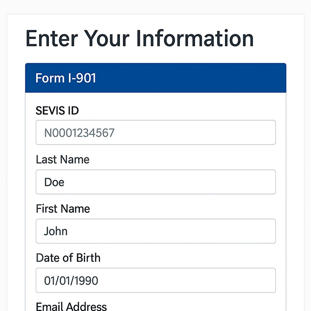 - فرم I-901 را باز کرده و شماره SEVIS ID (روی I-20 یا DS-2019 نوشته شده) را وارد کنید. سپسنام، تاریخ تولد و سایر اطلاعات شخصی را کامل کنید.